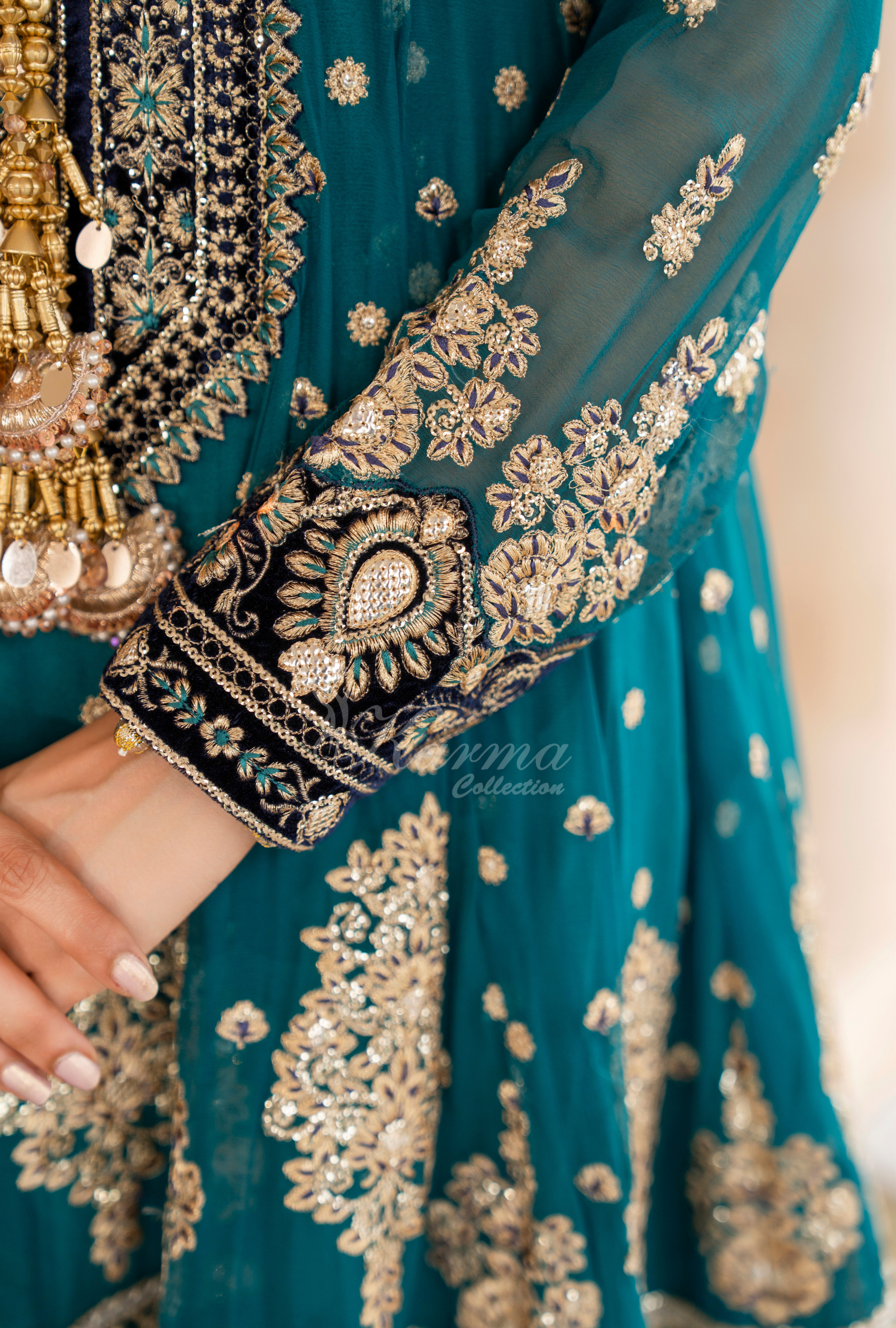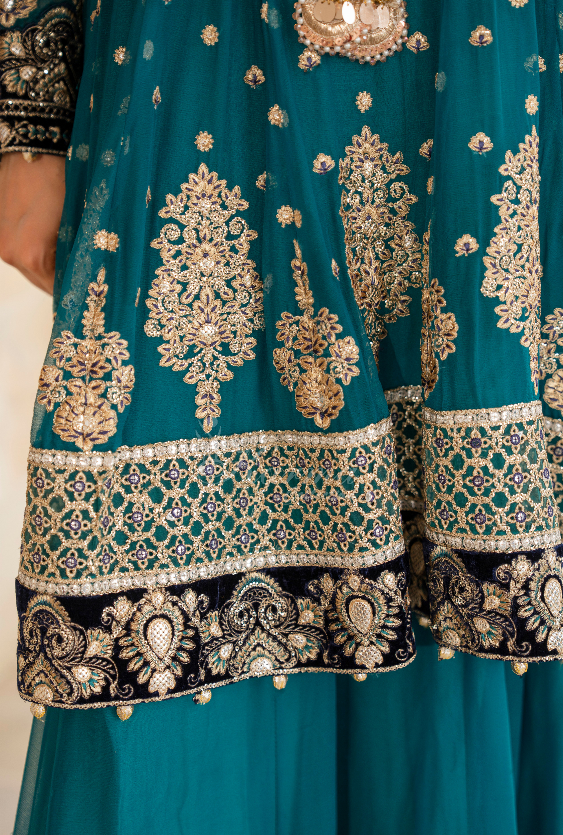 Velvet work on Sleeves and Neckline