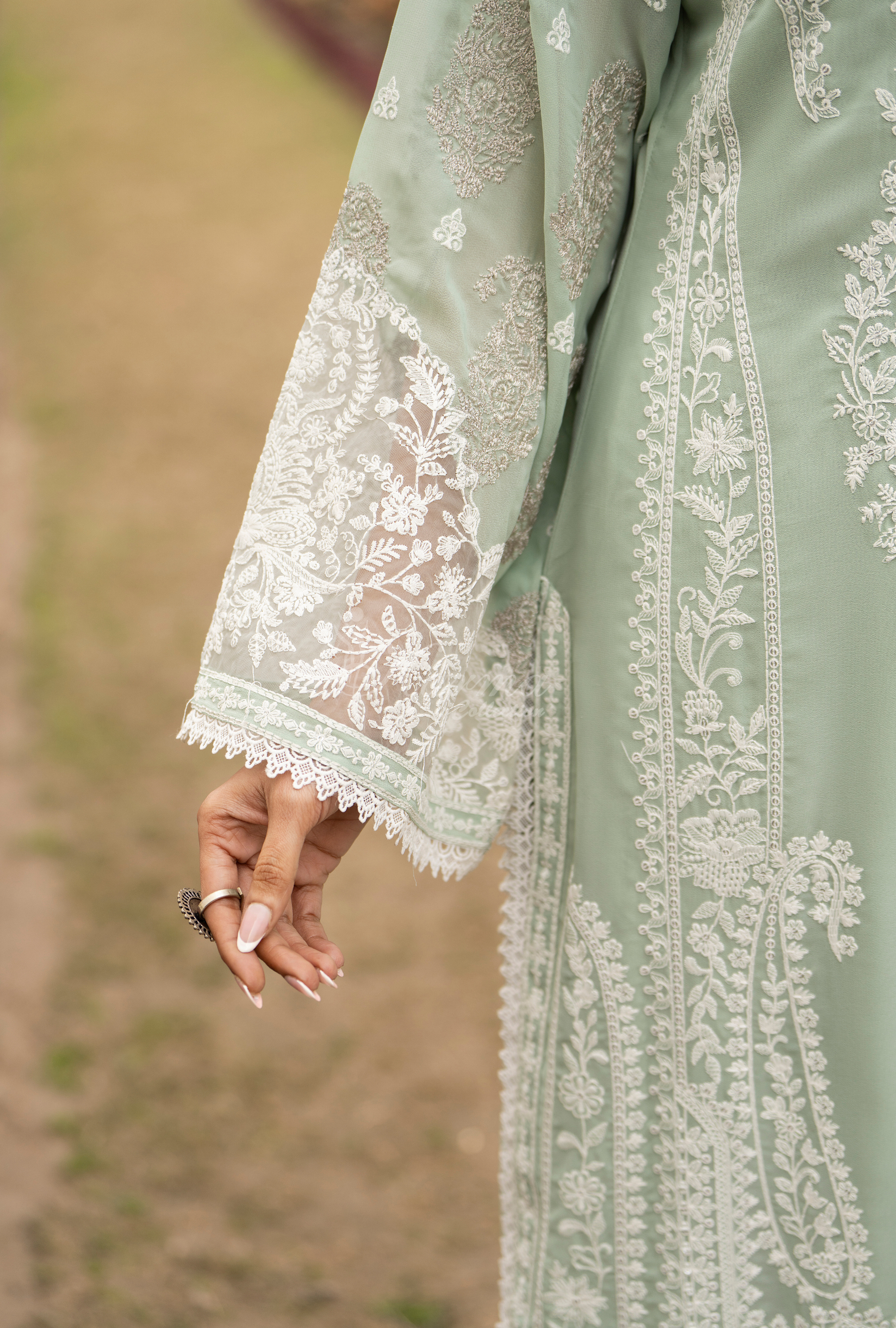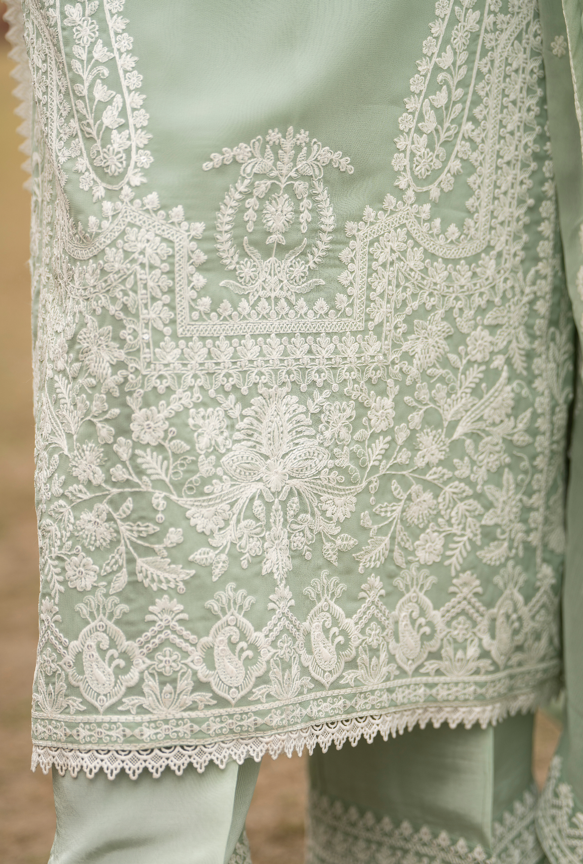 Georgette Long Shirt with Matte Thread Embroidery and Lace on Chalk